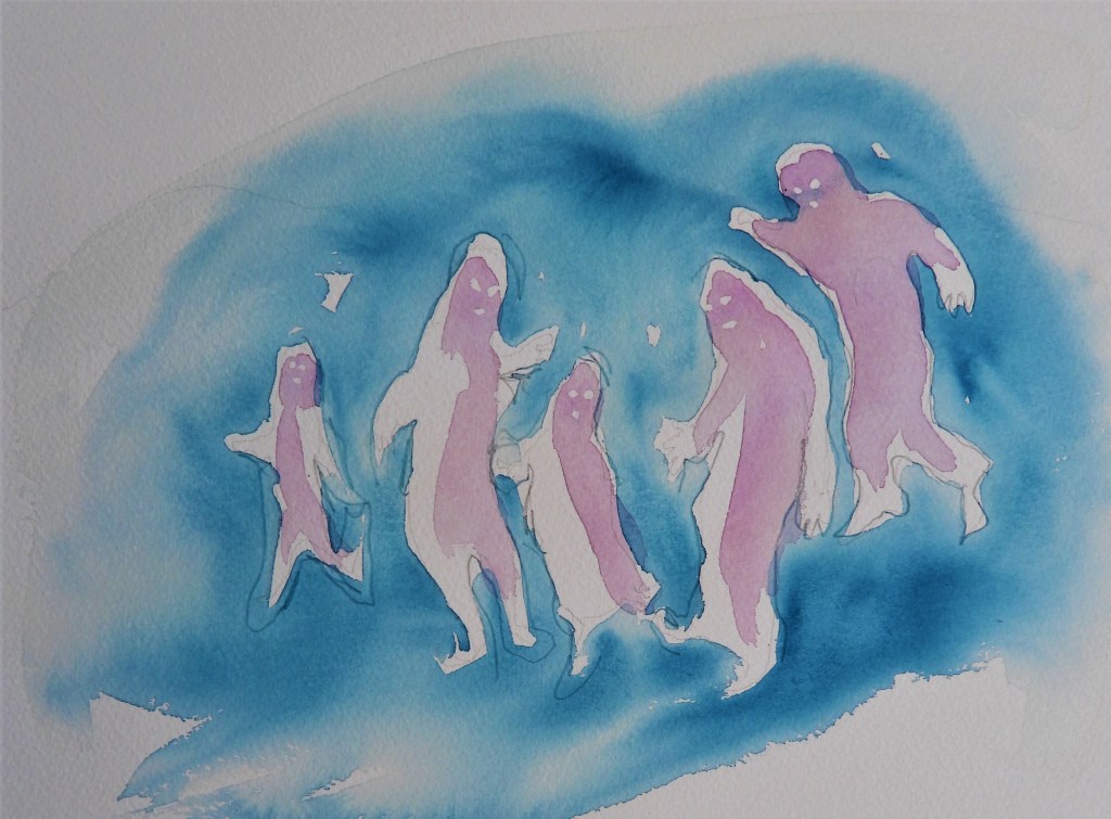„Hallo“, rief K. „Kannst du uns hören?“ Der kleine Nebel kam langsam näher. Dann zögerte er. „Papa“, kam eine ganz leise Stimme. „Papa?“. „O weh, eine Kinderseele“, sagte K. „Komm her, Kleine. Papa ist sicher auch da.“ „Hör auf mit dem Blödsinn“, meinte N. „Papa ist doch gar nicht hier. Die Kleine wird enttäuscht sein.“ „Woher wisst Ihr, dass es eine Mädchenseele ist?“ fragte F. „Wie heißt denn du?“ fragte er den kleinen Nebel. „Franzi. Seid Ihr Engel?“ „Ist jetzt Franzi ein Jungen- oder Mädchenname?“ fragte F. die Runde. „Vielleicht divers“, warf B. ein. „Entschuldigung, das sollte komisch sein“, fuhr er fort. Die anderen Nebel rückten wie tadelnd etwas von ihm ab. „Nein, Franzi, wir sind keine Engel“, rief K. „Wir waren Menschen wie du. Nur eben große Menschen.“ „Bin ich kein Mensch mehr?“ fragte der kleine Nebel ängstlich. „Wo ist Papa?“ „Papa ist wohl noch unten, auf der Erde, denke ich“, sprach K. „Wir wissen es nicht“, fügte sie hinzu. „Ihr wisst nicht, wo Papa ist? Ihr seid groß. Müsst wissen, wo Papa ist“, erwiderte der kleine Nebel. „Vielleicht sollten wir ihn rufen“, meinte O. Da riefen alle „Papa, Papa, Paaapa“. Und der kleine Nebel rief auch „Papa, Papa, wo bist Du?“ Plötzlich kam von weitem ein großer Nebel herangeschwebt. „Da bist du ja, Franzi. Ich habe dich gesucht.“ Der große Nebel flog zu den Anwesenden.