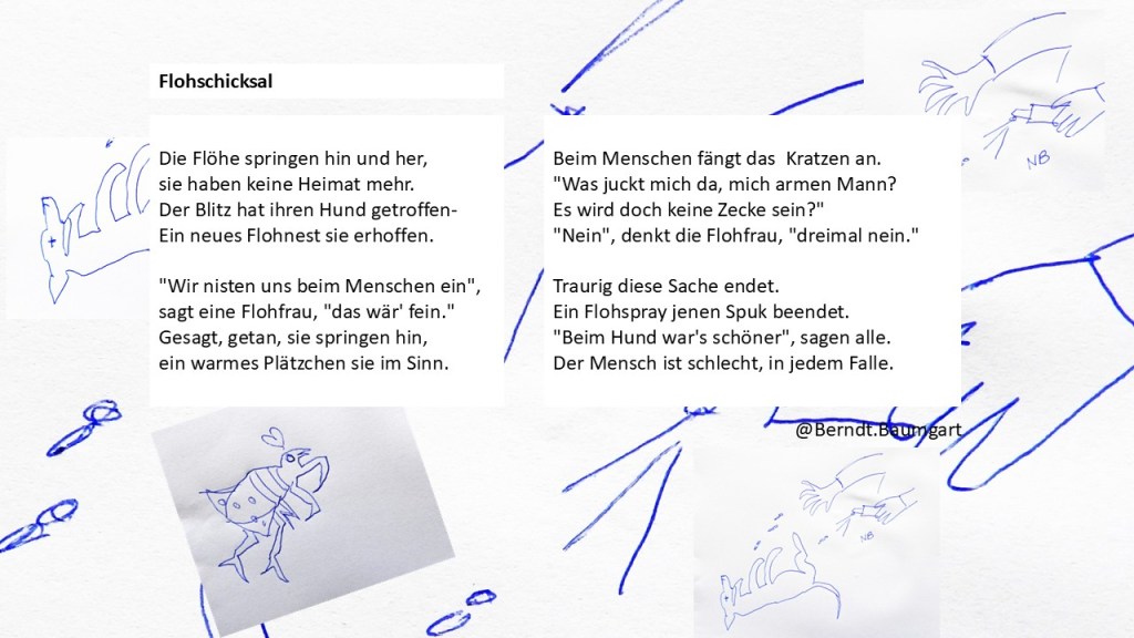 Es ist schwül, die Luft ist warm; da kommt ein großer Vogelschwarm. Er verdeckt das Sonnenhell, das geht alles blitzeschnell. Schon scheint die Sonne wie vorher. Ich fliege mit dem Vogelheer.